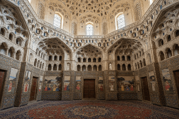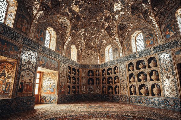 - دوره صفوی و قاجار: در این دوران، گچ با “آینهکاری” و “نقاشی روی گچ” ترکیب شد. تکنیک تنگبری (ایجاد حفرههایی به شکل ظروف در دیوارها) در کاخ عالیقاپو نمونهای بارز از نبوغ در استفاده دکوراتیو از گچ است.